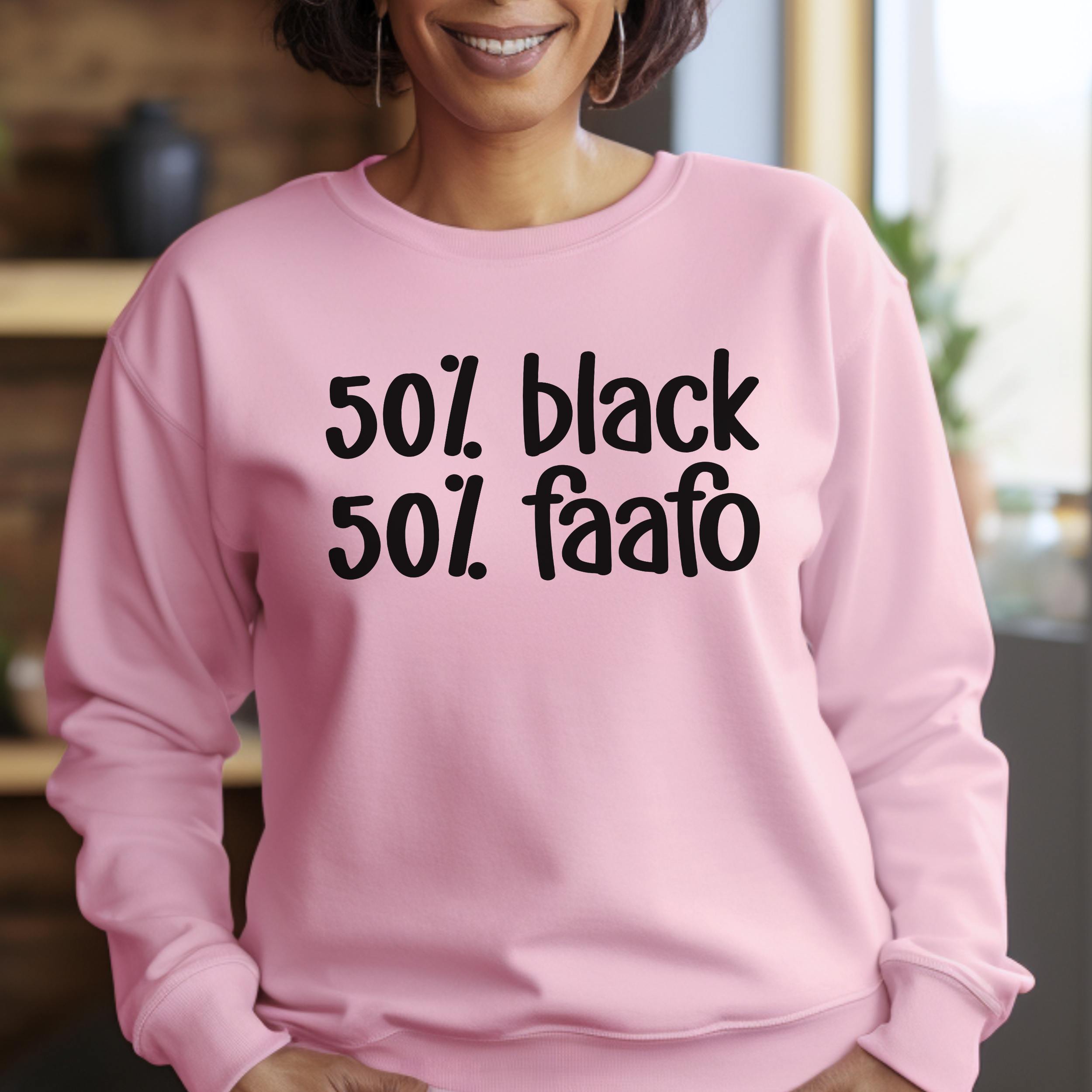 50% Black 50% FAAFO. FAAFO carries energy—a warning, a mindset, and a vibe: fuck around and find out. This sweatshirt is your declaration of fearless pride and unapologetic roots. It’s about standing firm and carrying strength in every step. Own your narrative and stay bold.